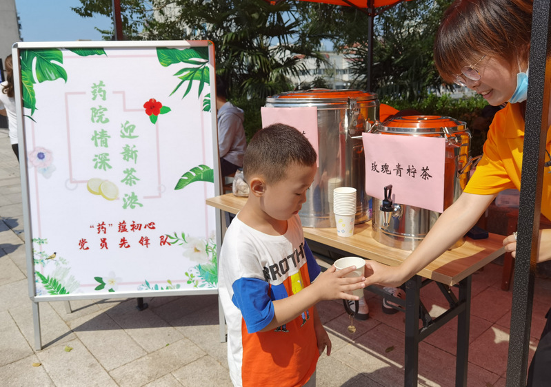 在迎新现场,“确认过眼神,是‘药’一起奋斗的人”、“争做未来屠呦呦”等富有药学特色的迎新横幅手幅以及可爱的药学卡通人物将迎新点装扮的新颖别致。学院“药”蕴初心党员先锋队精心准备玫瑰青柠茶、山楂桂花茶,为萌新、志愿者和家长们送来清凉,消暑降温的同时减去一路奔波的劳累。学院还为每位新生精心准备了第一份礼物盲盒,里面收集了各类干花、草药,宣传普及药用植物的价值,“药”与你约,草木情缘。