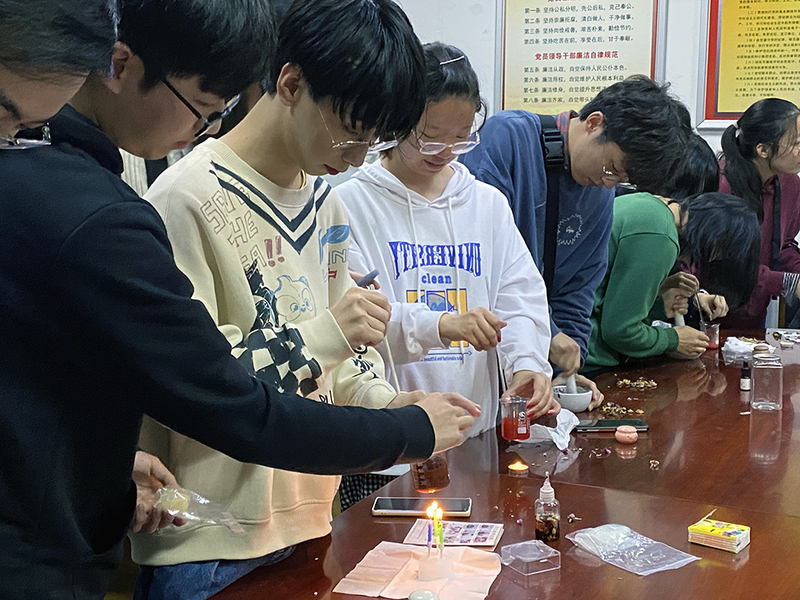 此次比赛共有14支队伍参加,各小组同学首先将玫瑰、菊花等花瓣研磨成粉,随后加入花油、蜂蜡等常用药剂,在点燃的蜡烛上加热并均匀搅拌,最后倒入磨具,冷却10分钟,一款简易的胭脂就完成了。活动现场,同学们还用自制的胭脂进行化妆,小组成员们分工协作,笑声不断。本次活动将过去与现代,传统与潮流相结合,既有效培养了学生古法制作胭脂的技巧,也激发了学生对学习药物科学的热情。