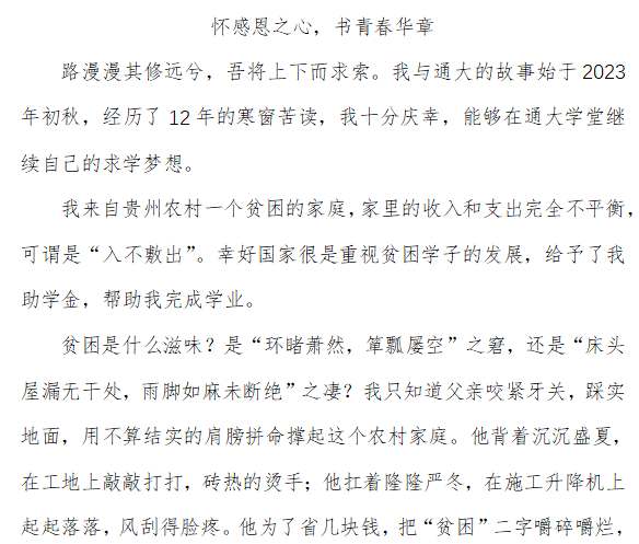 本次活动主要面向国家助学政策中受到资助的学院学子,让同学们结合自身求学成长经历,以“亲历者”的视角和口吻,生动描述在资助政策的帮助下所发生的变化,突出反映国家资助政策实施效果和受助学生的获得感,深刻表达对国家、社会的感恩之情,传递正能量。活动中,同学们踊跃投稿,共征集作品65篇,经过评审,郭佳怡等5名同学获一等奖,仇瑞婷等8名同学获二等奖,丁圣明等15名同学获三等奖。