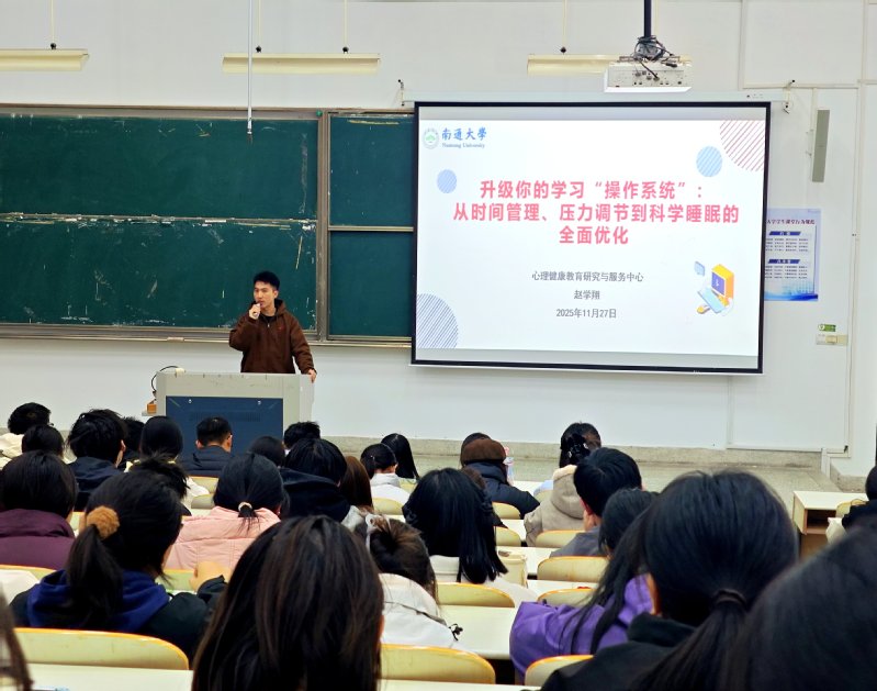 赵老师以“升级你的学习‘操作系统’:从时间管理到科学睡眠的全面优化”为题,他将大学所需的能力体系比喻为一套需要迭代的“操作系统”,并提供了详尽的“升级方案”。他不仅介绍了时间管理中的四象限法、番茄工作法等经典工具,更分享了两个关键认知:一是强调“合理做计划”需保持弹性,采用“周计划”与“日清单”结合;二是深刻指出“自律不等于控制时间,而等于完成关键事件”,引导学生从追求时长转向聚焦核心任务。此外,他还分享了缓解压力的“腹式呼吸法”、“蝴蝶拍”技巧,以及基于R90周期的科学睡眠与“能量盹”方法,帮助同学们构建从高效学习到积极休息的完整闭环。