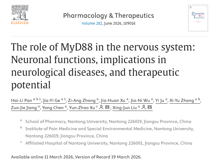 近日,3044永利刘兴君教授、特种医学研究院潘海莉教授、附属医院徐云钊教授应邀在国际期刊《Pharmacology and Therapeutics》上发表题目为“The Role of MyD88 in the Nervous System: Neuronal Functions, Implications in Neurological Diseases, and Therapeutic Potential”(MyD88在神经系统中的作用:神经元功能、在神经系统疾病中的意义及治疗潜力)的综述论文,系统阐述了MyD88蛋白在免疫信号通路和中枢神经系统(CNS)中的研究进展,并重点阐述了其在CNS疾病如阿尔茨海默病(AD)、帕金森病(PD)、肌萎缩侧索硬化(ALS)、脑中风和颅脑损伤等,以及慢性疼痛中的功能和潜在的治疗作用。